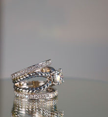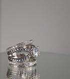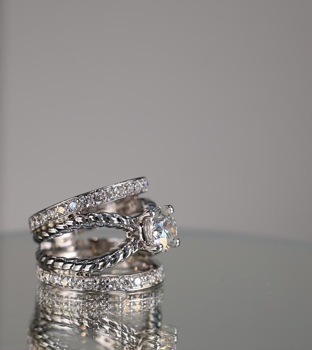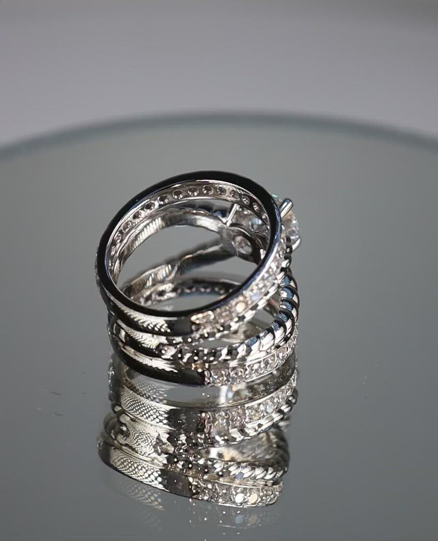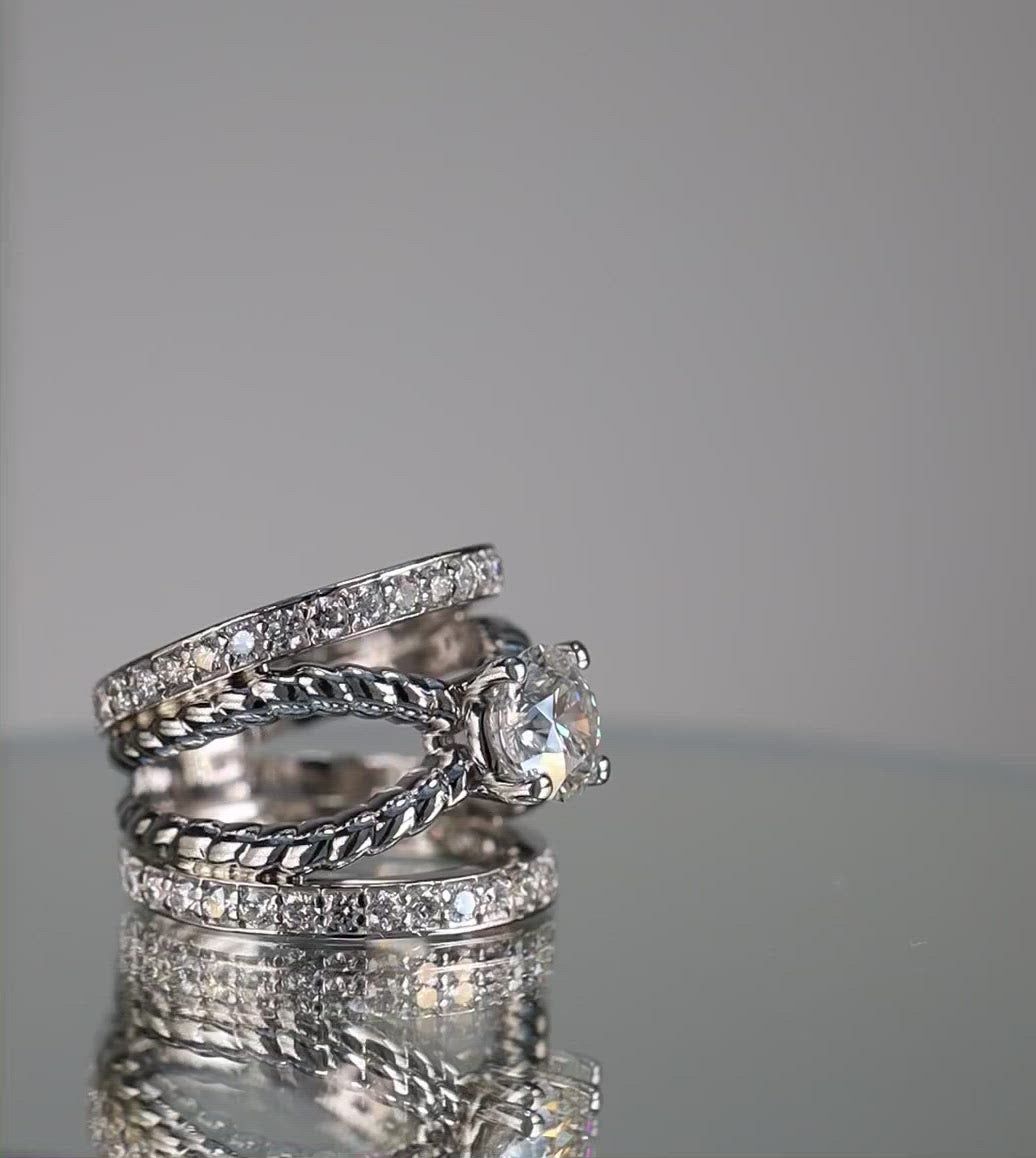 Absolutely stunning piece! This unique platinum ring features two rope style bands that cradle a 1.50ct natural round brilliant diamond center stone and 1.25ct of accent diamonds on two connecting platinum bands.