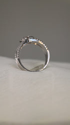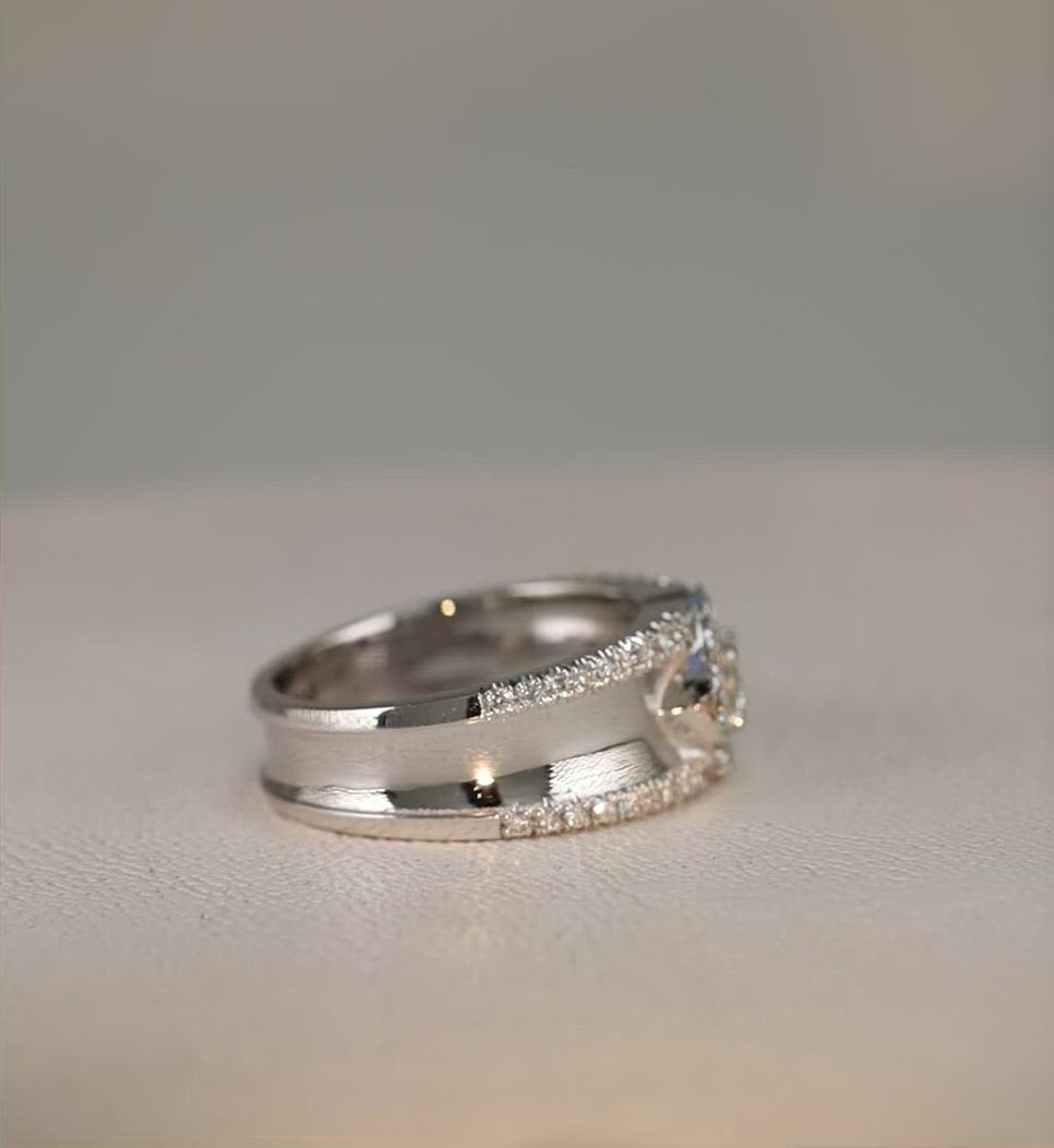 Lessard Coutu exclusive concave 14KT white gold halo diamond ring with a stunning high polish that extenuates the forty-nine diamonds.
